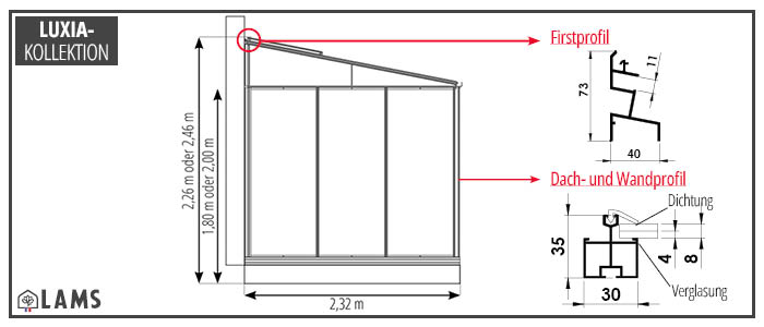 Maße des Anlehngewächshauses LUXIA mit einer Tiefe von 2,32 m