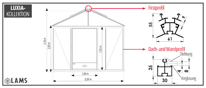 Das Gewächshaus-Modell LUXIA ist 3,09 m breit und in 5 Längen zwischen 3,09 m und 6,04 m verfügbar.