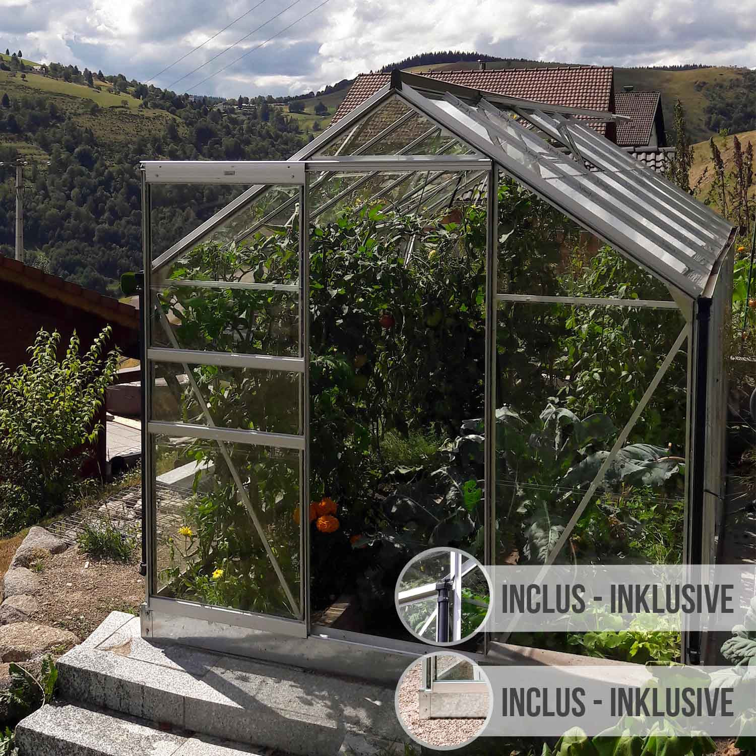 Tous les modèles de notre serre en verre LAMS Allium sont livrés avec base (de la même couleur que la serre). La base facilite le montage de la serre et constitue une protection contre les chocs (motoculteur, tondeuse...). Il faut vous assurer que le sol est plan avant montage.