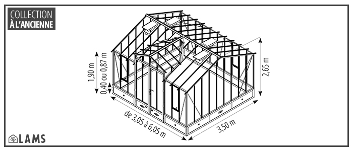 LAMS, fabricant spécialiste de la serre et du jardin d´hiver depuis plus de 30 ans, met son savoir-faire à votre service : trouvez la serre qui vous convient dans notre large collection de serres de qualité conçues et fabriquées dans nos ateliers en Vendée. Tout à la fois une serre de culture, un abri pour vos plantes et un charmant jardin d'hiver tout en transparence, la serre à l'ancienne CLASSIQUE de largeur 3,50 m LAMS vous invite à cultiver la douceur de vivre. Pour votre serre, nous avons sélectionné des matériaux de qualité :