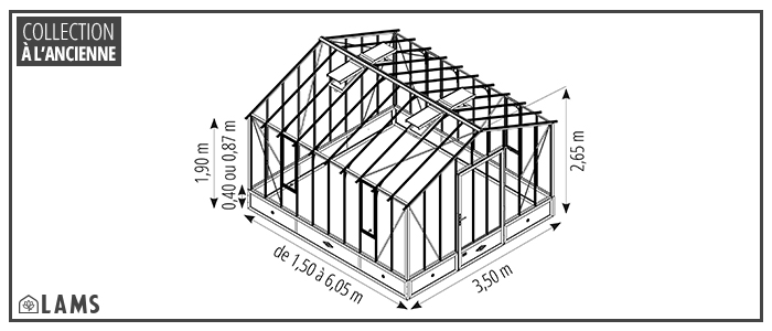 LAMS, fabricant spécialiste de la serre et du jardin d´hiver depuis plus de 30 ans, met son savoir-faire à votre service : trouvez la serre qui vous convient dans notre large collection de serres de qualité conçues et fabriquées dans nos ateliers en Vendée. Tout à la fois une serre de culture, un abri pour vos plantes et un charmant jardin d'hiver tout en transparence, la serre à l'ancienne CLASSIQUE de largeur 3,50 m LAMS vous invite à cultiver la douceur de vivre. Pour votre serre, nous avons sélectionné des matériaux de qualité :