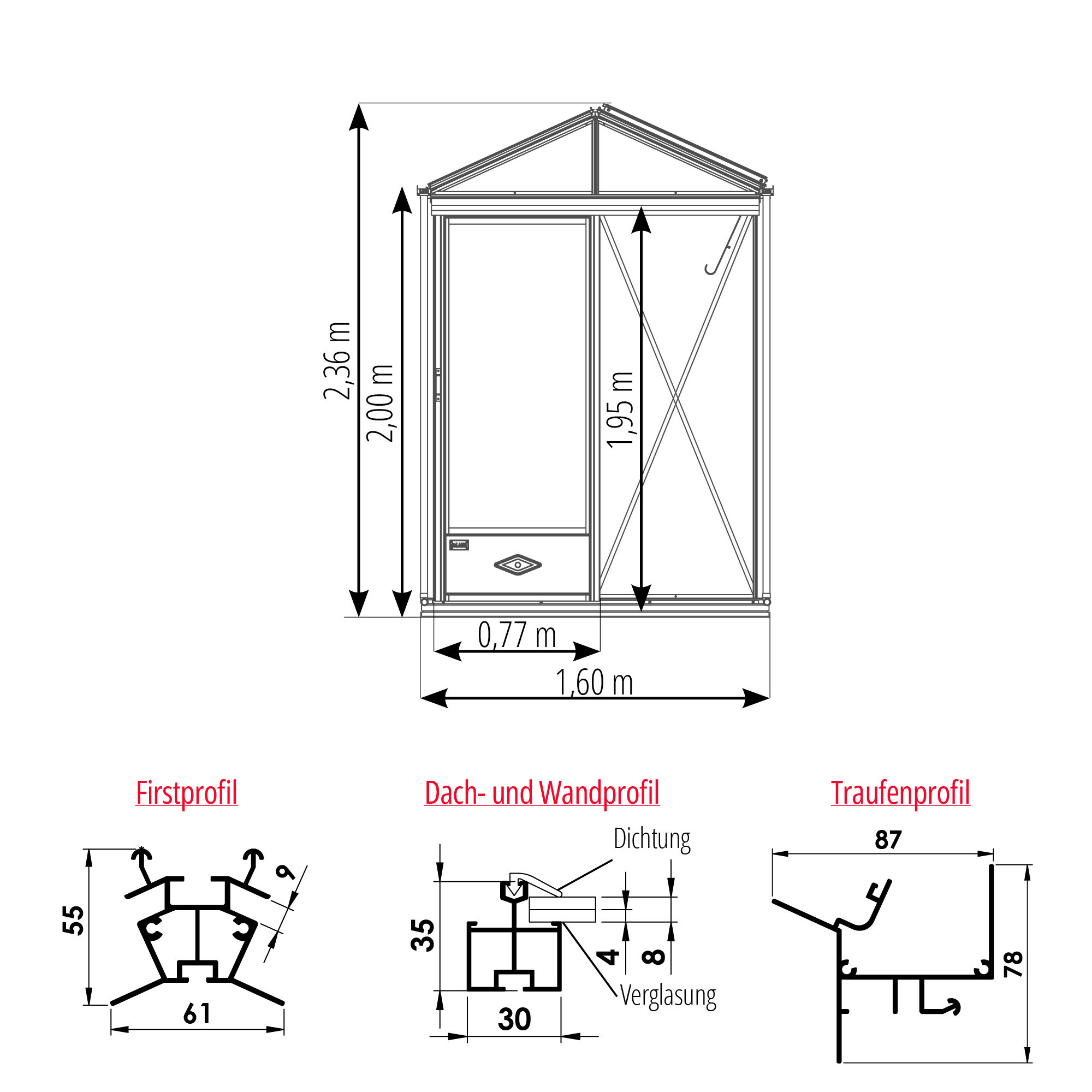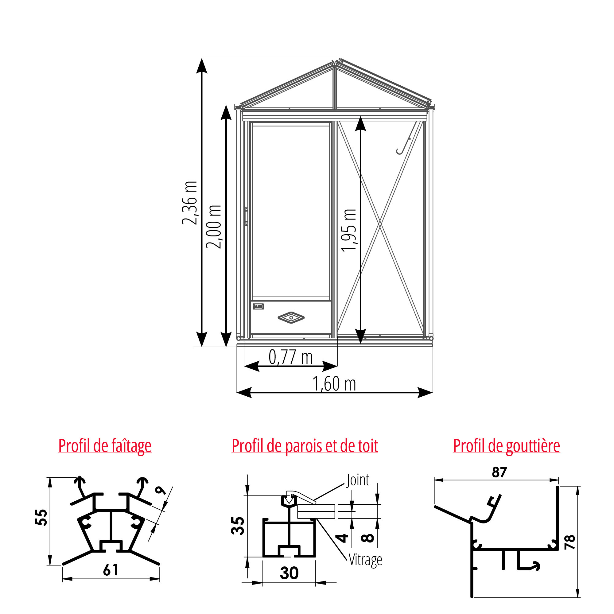 Dimensions de la serre de jardin LUXIA avec une façade d'1,60 m