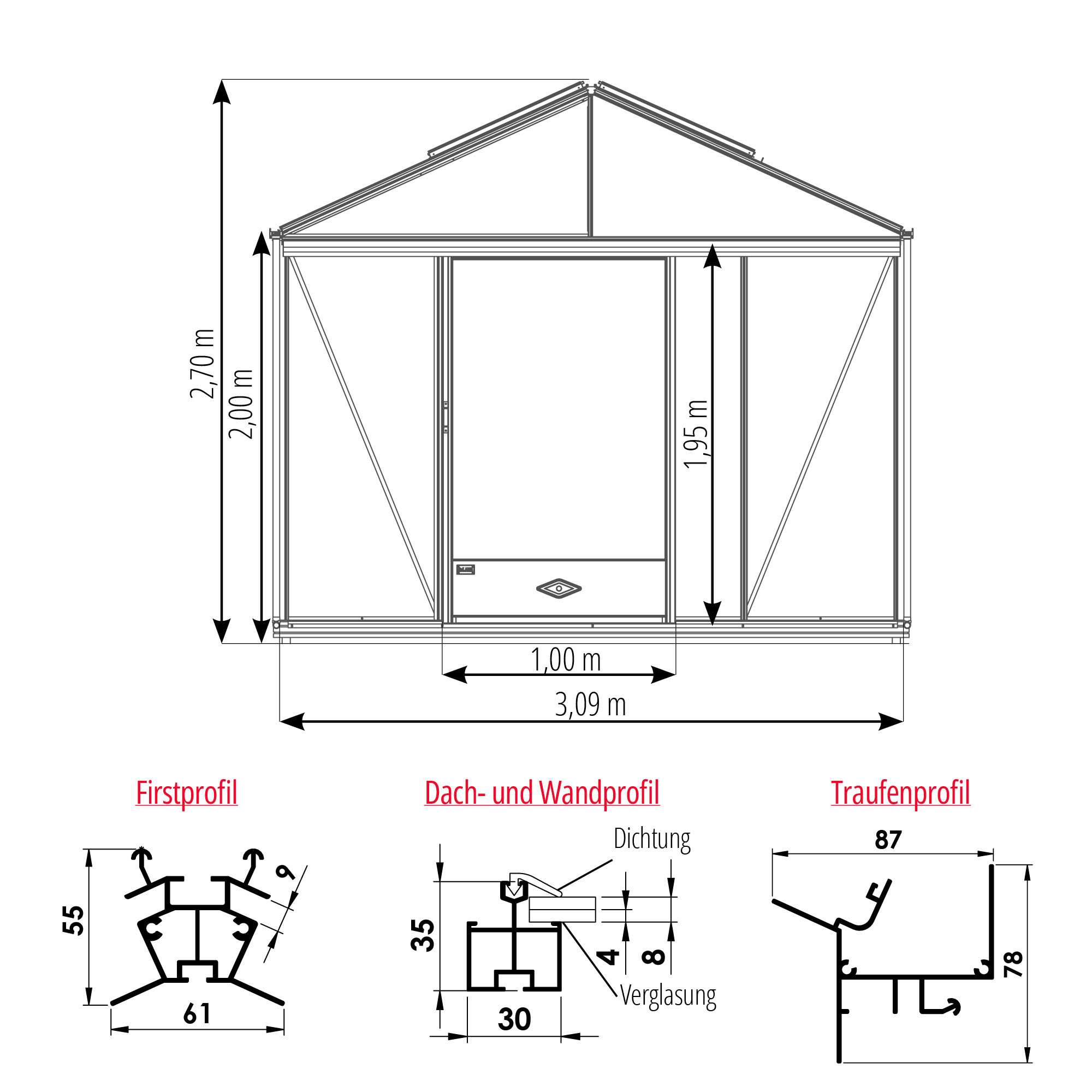 Dimensions de la serre de jardin LUXIA avec une façade d'3,09 m