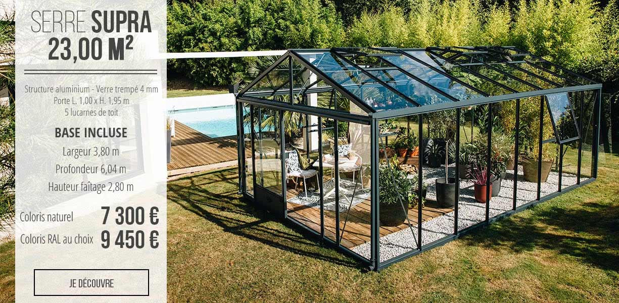 C’est la grande serre de jardin par excellence dont vous aimerez sûrement faire un salon, une pièce de réception, un abri pour votre spa … au cÅ“ur de votre jardin. Les modèles vont de 12 à 38 m². C’est aussi une serre idéale pour cultiver dans un grand espace. Ses profils aluminium sont conçus pour des vitrages de 4 à 16 mm d’épaisseur : en option, vous pouvez installer des panneaux de polycarbonate de 8 mm sur le verre trempé pour accroître l’isolation de votre serre ou en faire une serre chaude avec des panneaux de 16 mm. C’est une serre haute sous gouttière, la porte est de 1 m de large sur 1,95 m de haut, et le modèle de 4,60 m de façade est équipé d’une porte de 2 x 1,00 m. Les hauteurs de faîtage vont de 2,70 m à 2,95 m. La serre Supra offre un panel d’options et de dimensions pour des projets variés.Â